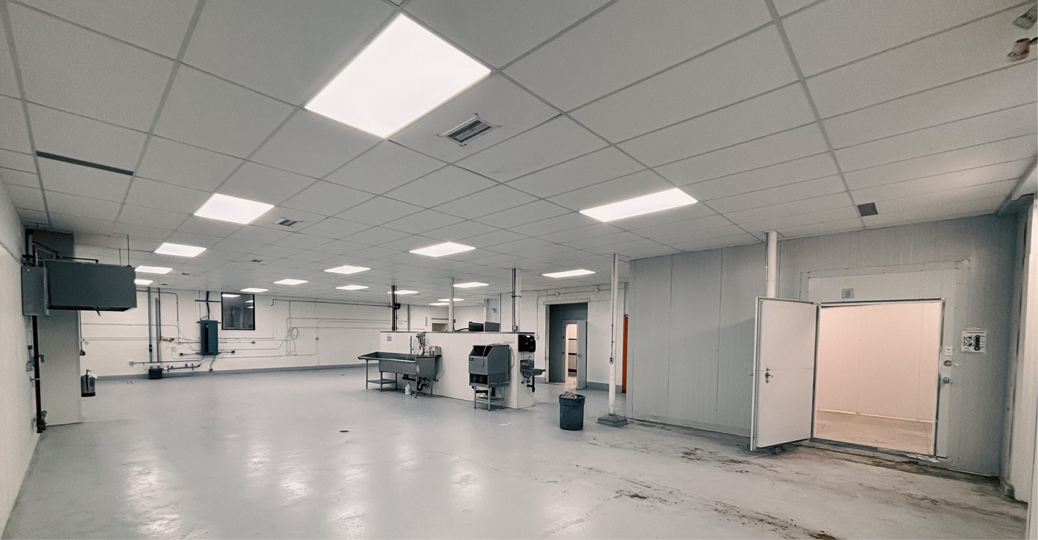 - Commercial kitchen includes walk-in coolers and freezers, air makeup, food grade flooring, and heavy power